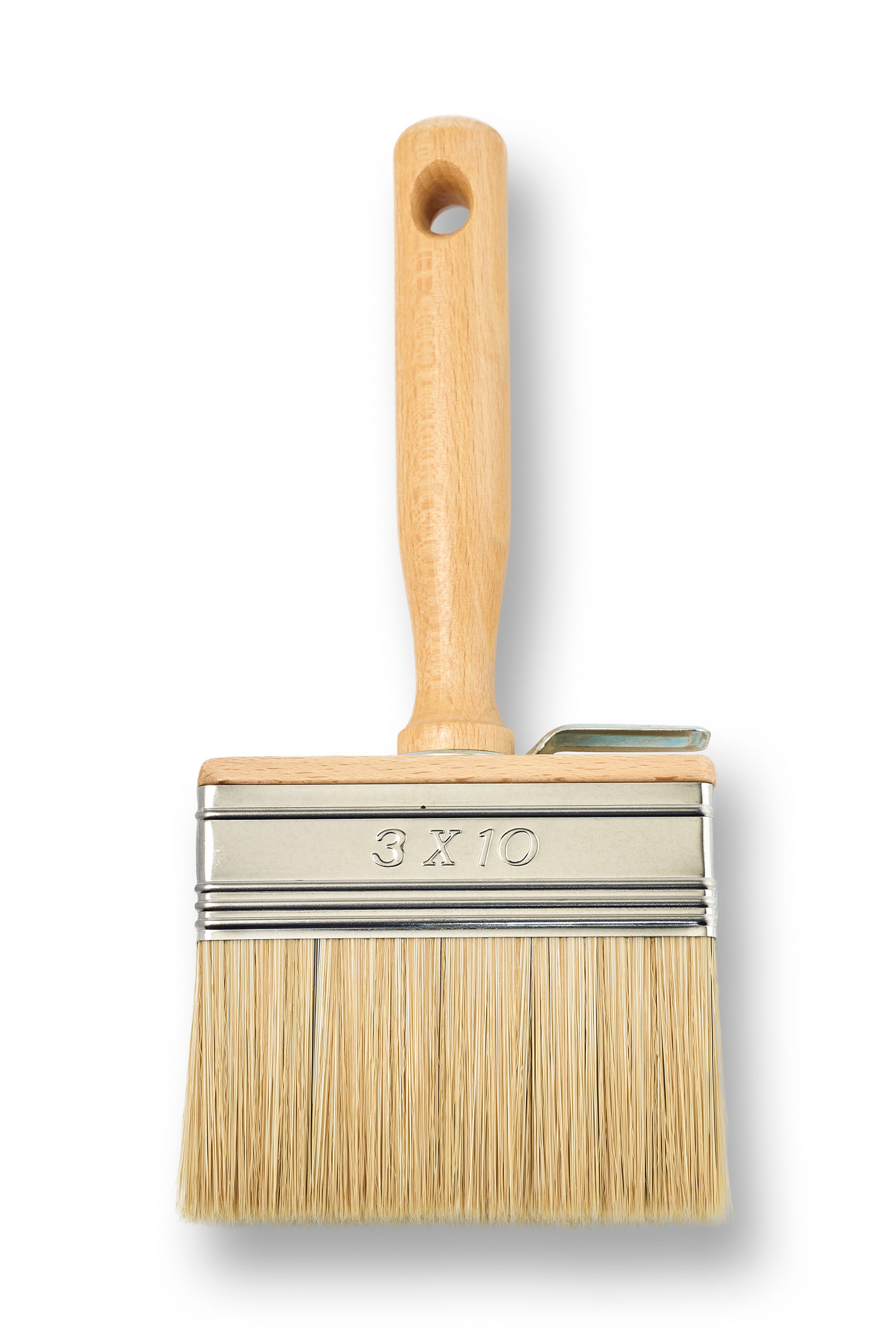 Professional block brush, made from a blend of white Chinese hog bristle and white solid polyester fibers, lacquered wooden handle.