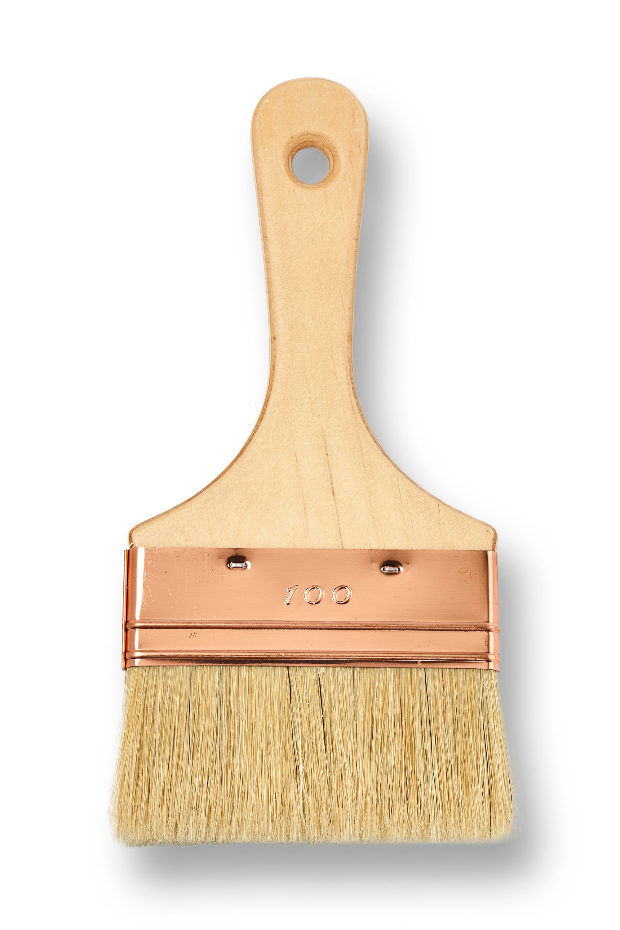 Spalter brush suitable for both water-based and synthetic paints and varnishes, made from a blend of white Chinese hog bristle and white solid polyester fibers, lacquered wooden handle.